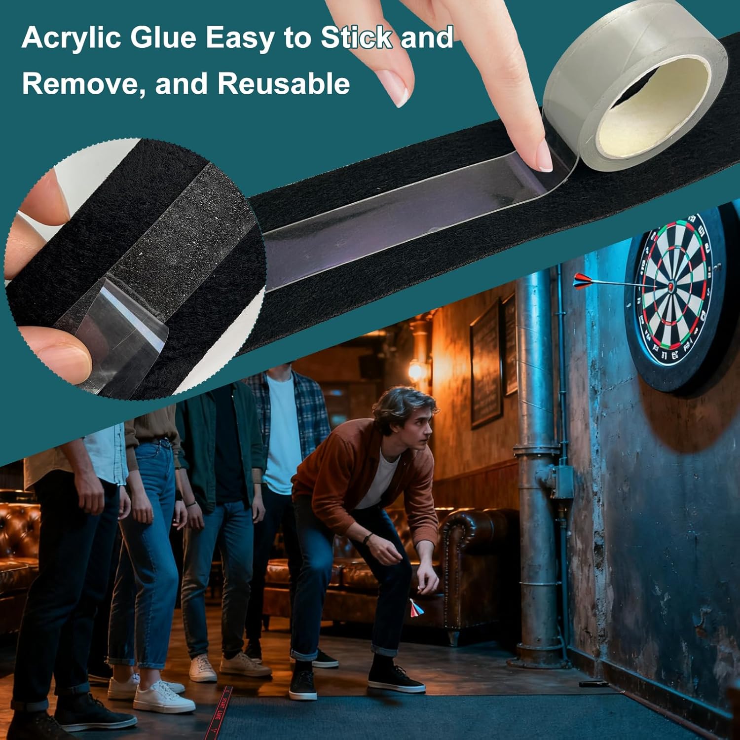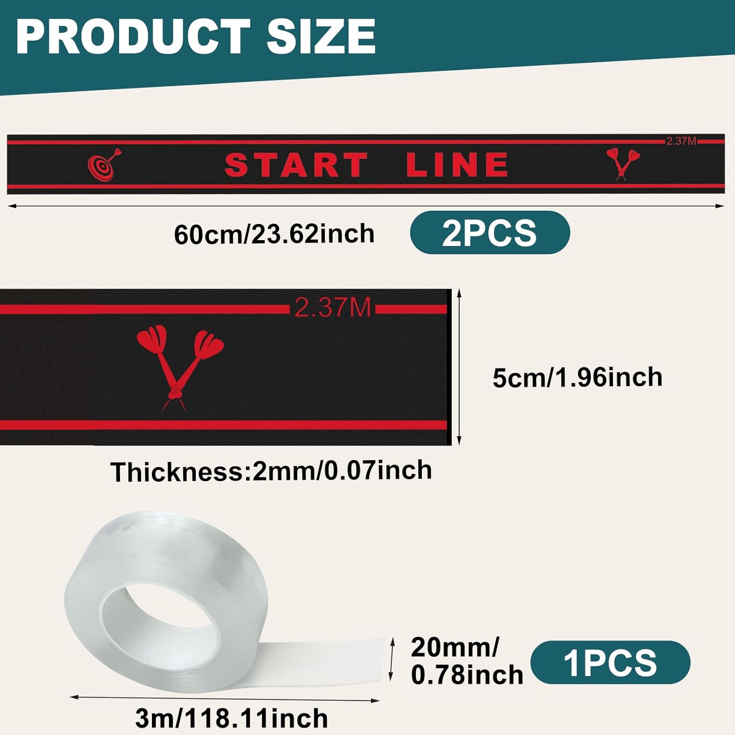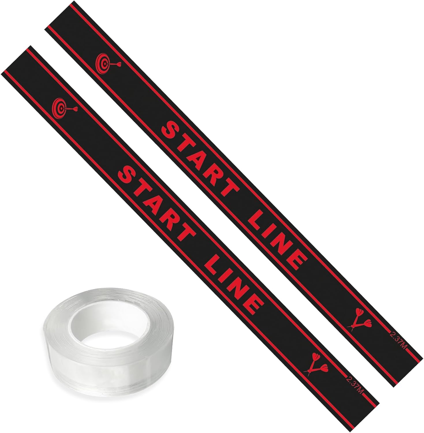 3.【Package Includes】: The package contains two black dart distance lines for dart enthusiasts and a roll of double-sided adhesive tape (2 cm wide, 3 m long, 1 mm thick)