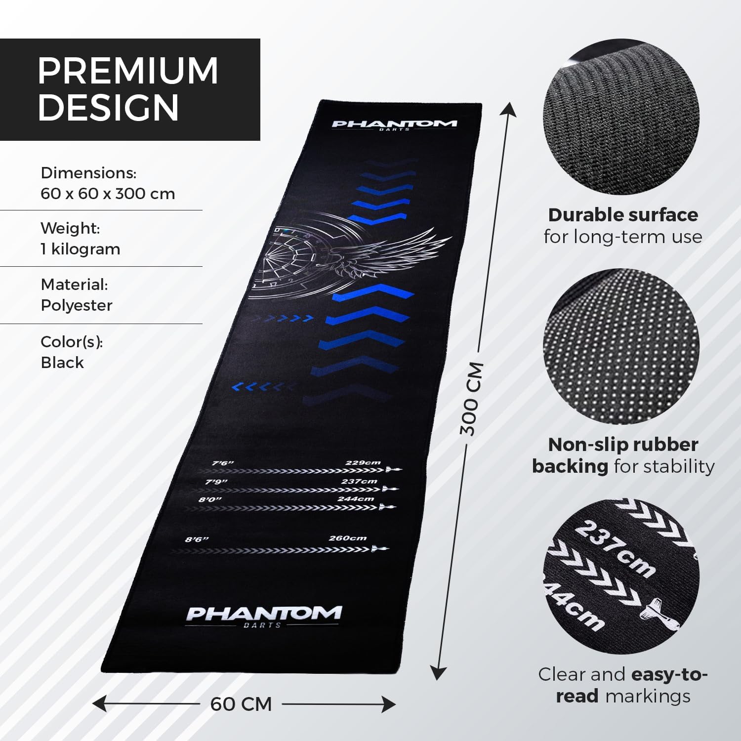 Upgrade your darts setup with this premium darts mat with oche, designed for both casual players and professionals. Featuring regulation throwing distance lines and clear oche markings, this versatile dart board mat ensures accurate practice and fair competition whether you’re at home or in the pub. Known variously as an oche mat, darts oche mat, dart oche, or even a darts hockey, this essential accessory replicates the authentic setup of official matches. Built with a non-slip rubber backing, the mat remains securely in place during play, preventing slips and ensuring stability. As a dart mat for floor protection, it safeguards against stray darts, scuffs, and damage while maintaining a stylish and professional appearance. The portable darts mat rolls up easily for convenient storage or transport, making it ideal for apartments, games rooms, and competitive events alike. With official measurements and precision markings, this dartboard mat with oche provides clear visual guidance to help players improve stance, throwing accuracy, and consistency. The durable design withstands regular use while enhancing your darts corner with sleek graphics and practical functionality. From beginners seeking accuracy to seasoned players honing skills, the darts distance mat offers an authentic oche experience. Whether you need a darts matt with oche for casual fun, a dart mat with oche for training, or a professional dart mat for home and pub tournaments, this product delivers. Combining style, protection, and performance, it transforms any space into a professional-standard darts area. With Phantom’s attention to detail, this is the ultimate choice for players who want more than just a mat — they want a complete upgrade to their darts game.