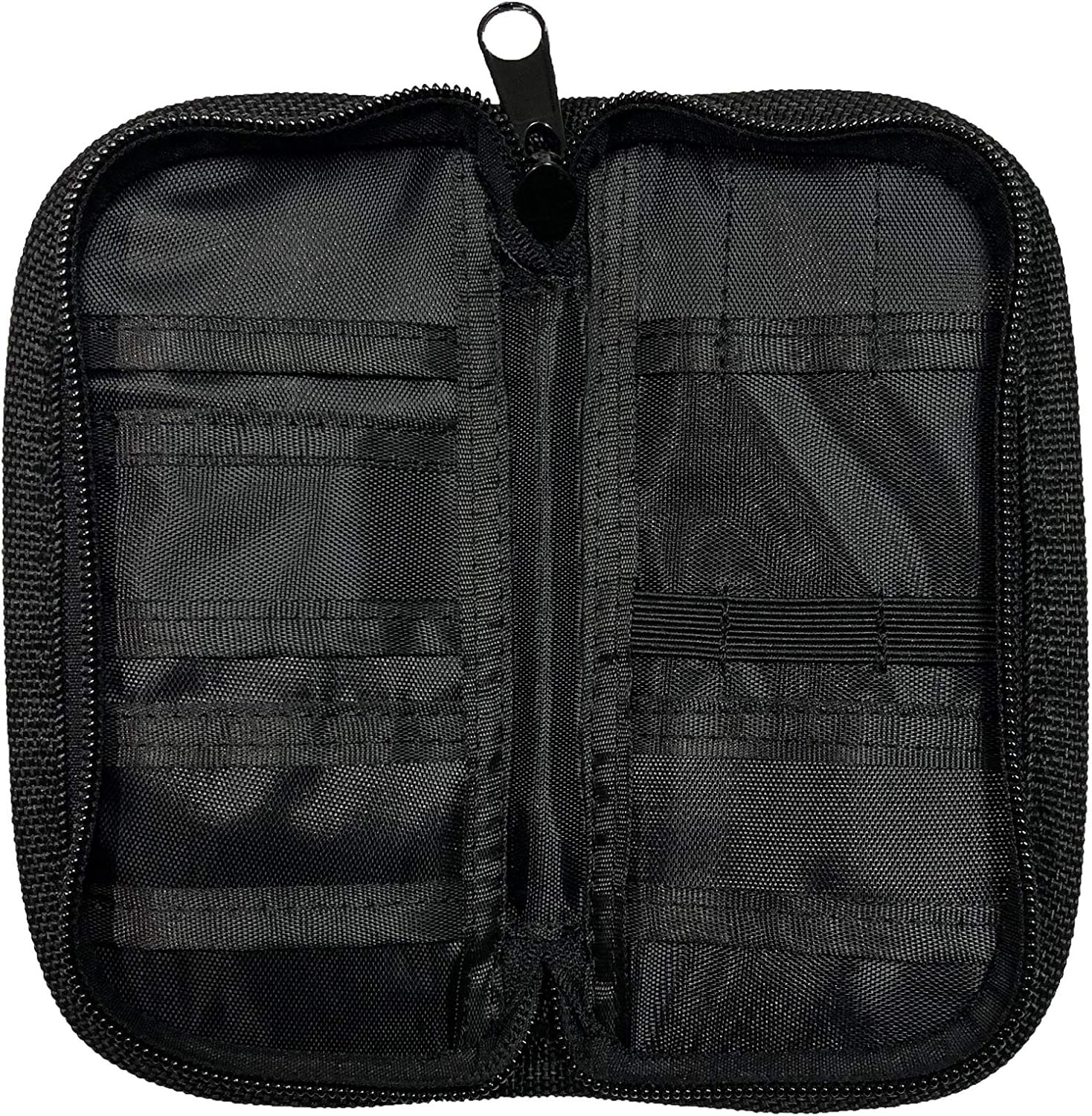 Wallet has compact version. It holds darts fully loaded. The other features are versatile and secure storage,