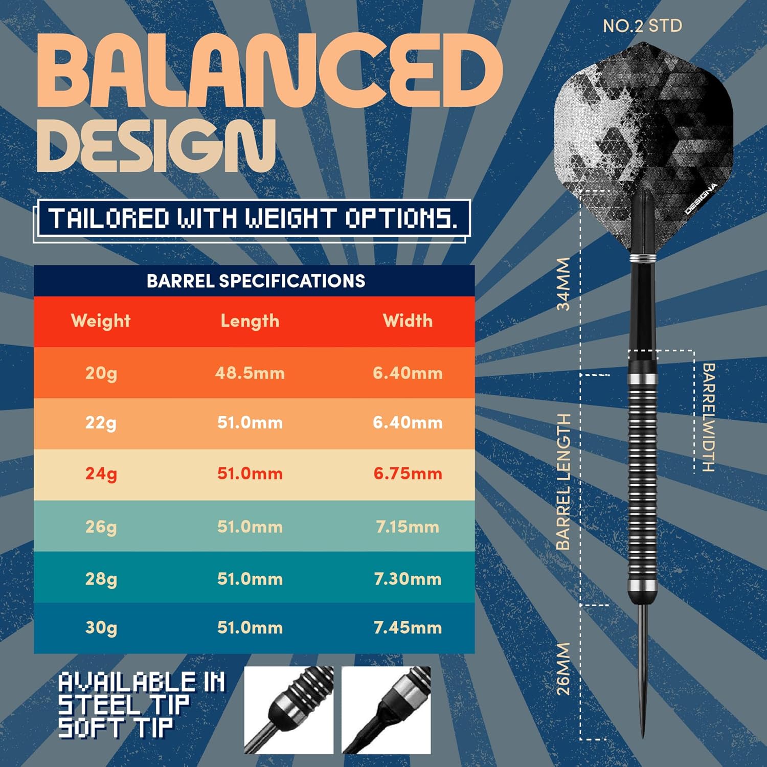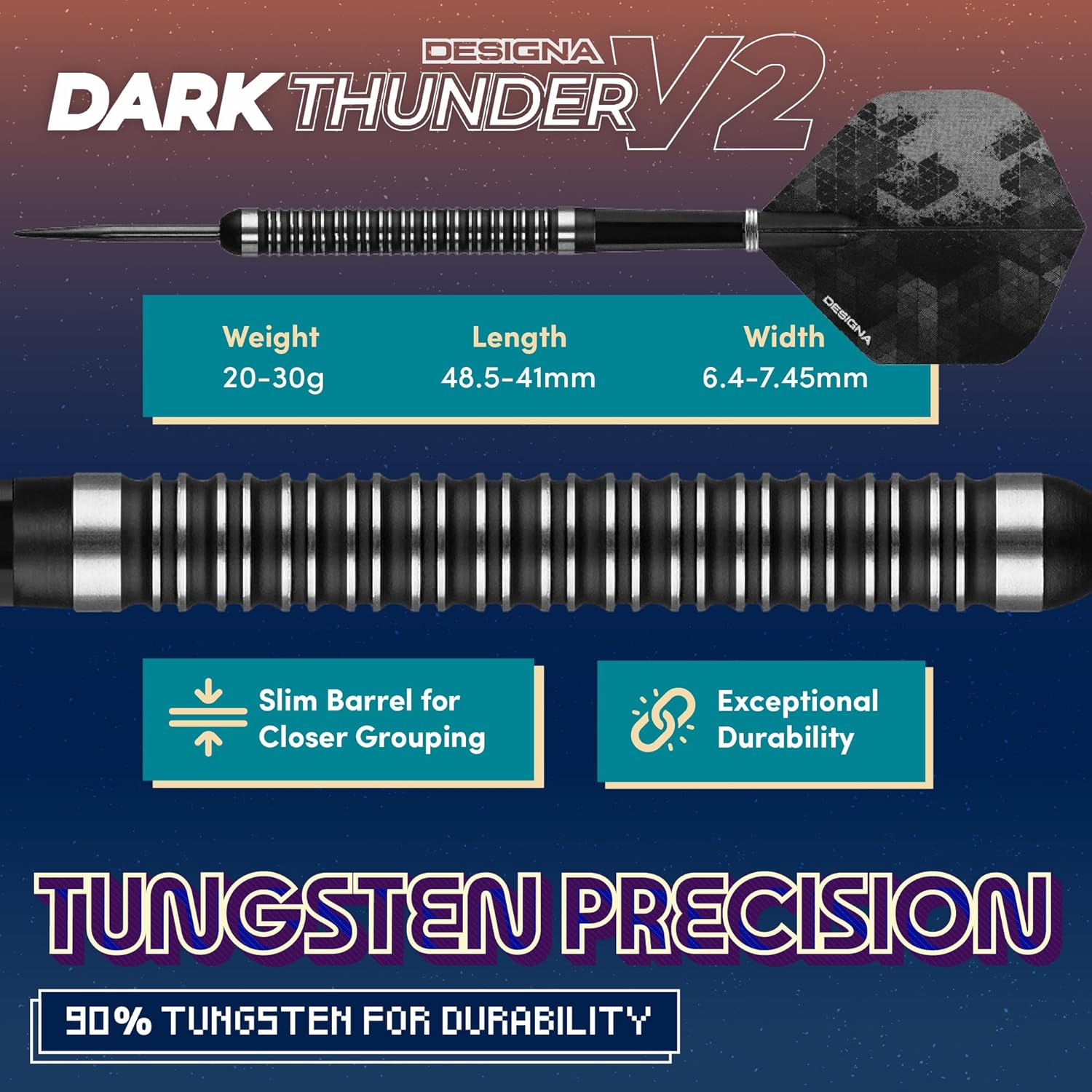 Crafted from 90% high-grade tungsten, the Dark Thunder barrels feature a twin ringed grip design that provides the perfect blend of comfort and control. The precision-machined profile ensures superb balance, allowing for tighter groupings and improved accuracy on the board.