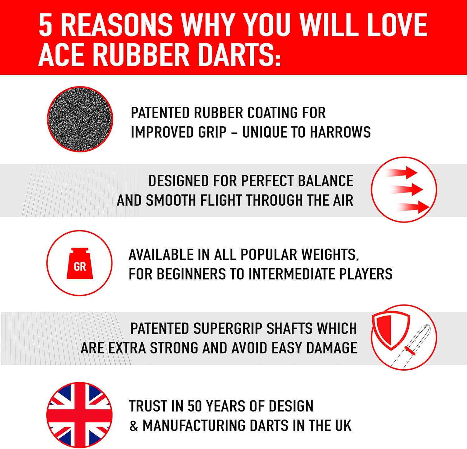 π£π₯π’ πππ₯π§π¦ π£π₯ππππ¦ππ’π‘: Harrows Excellent Ace Rubber Brass Steel Tip Darts Set gives ultimate dart precision like Pro Players. The unique vulcanised rubber grip ensures non-slip control, so you can dominate the dartboard with ease.