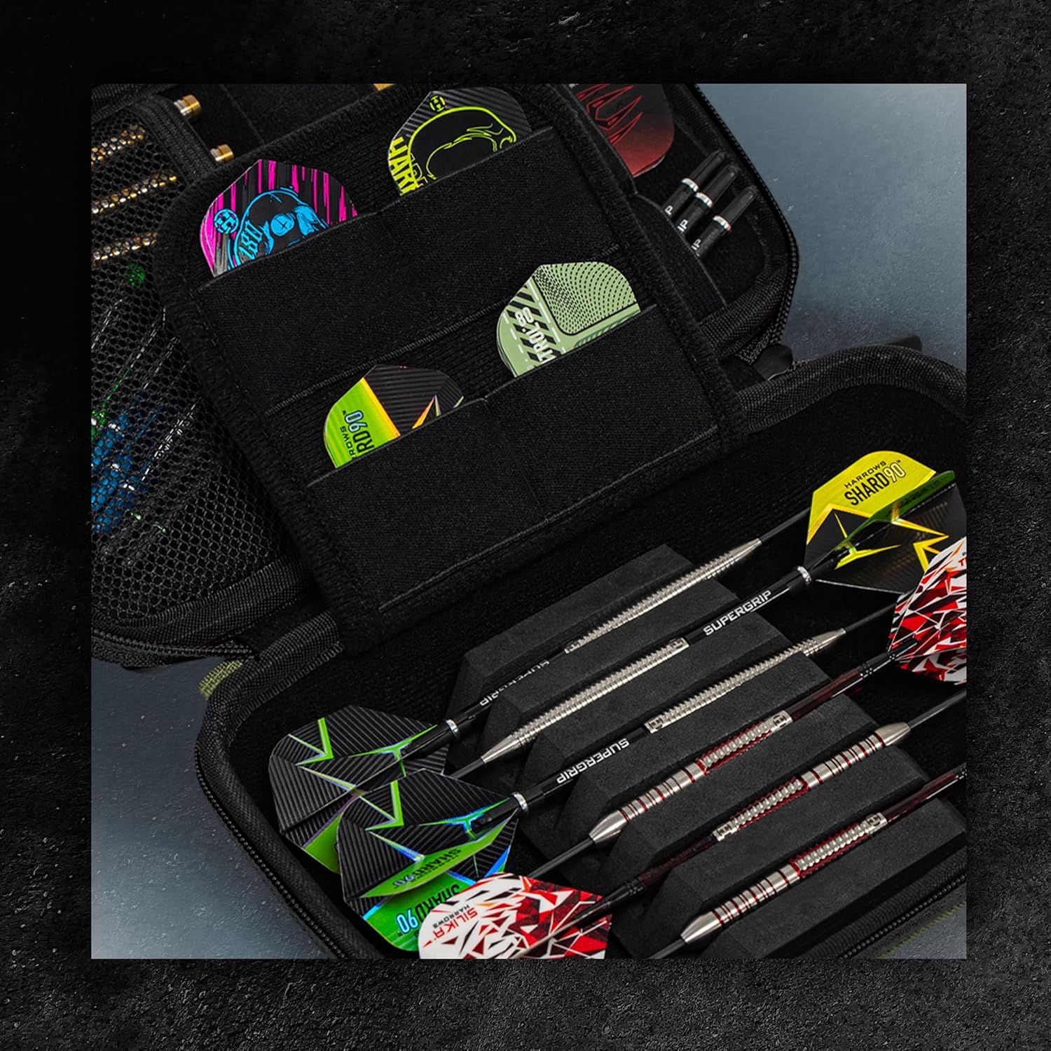Darts and Accessory case for 3 or 6 fully assembled darts: This case holds 3 or 6 fully assembled darts and keeps them secure and protected in non-scratch foam.
